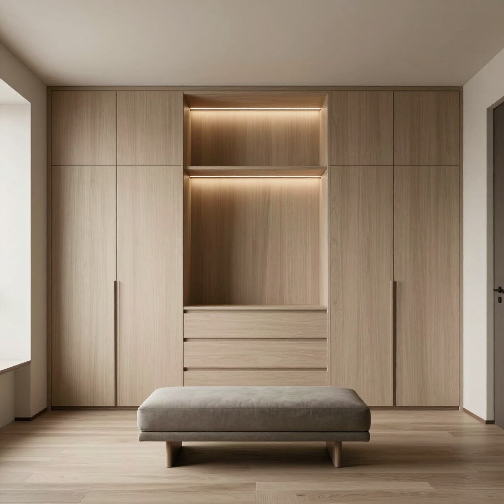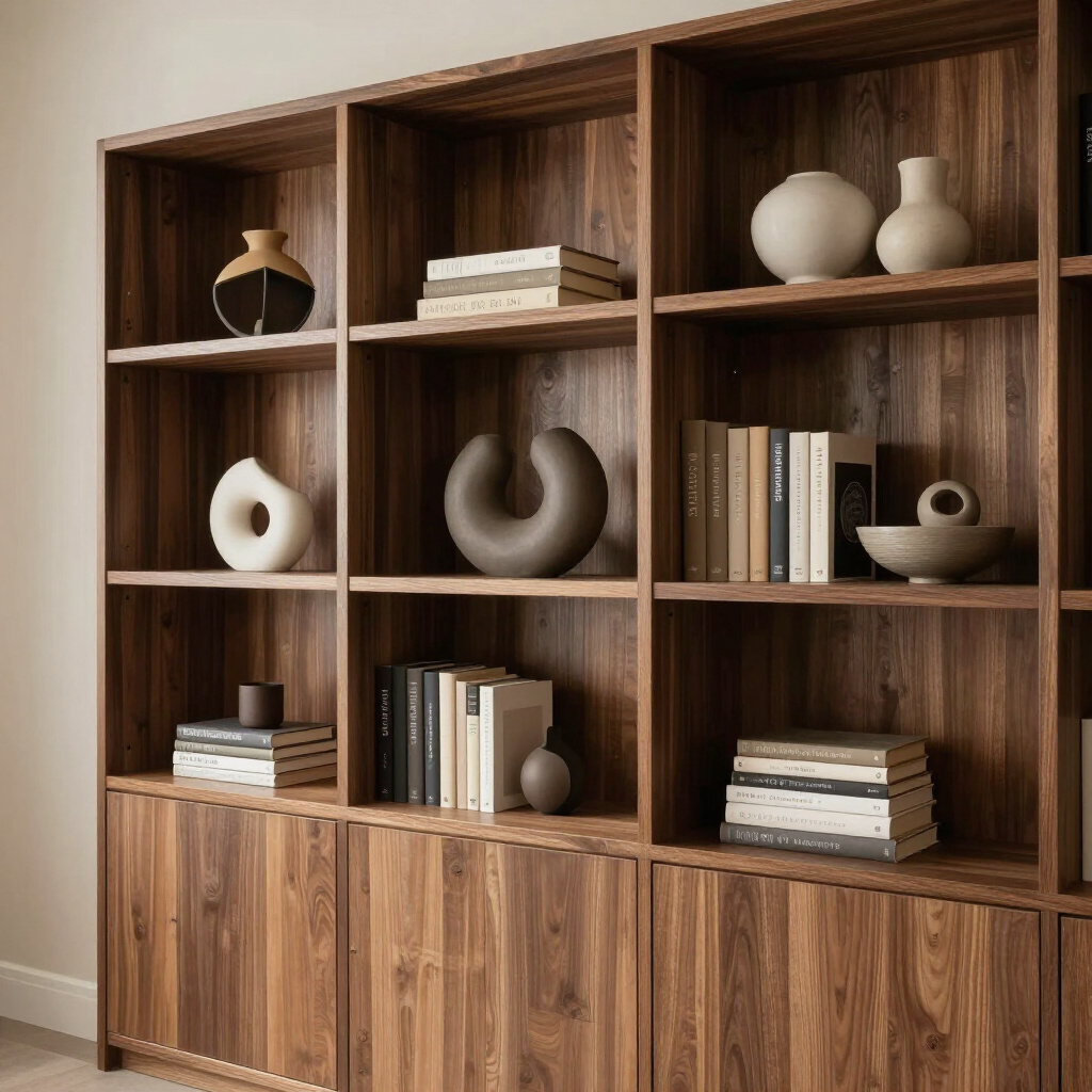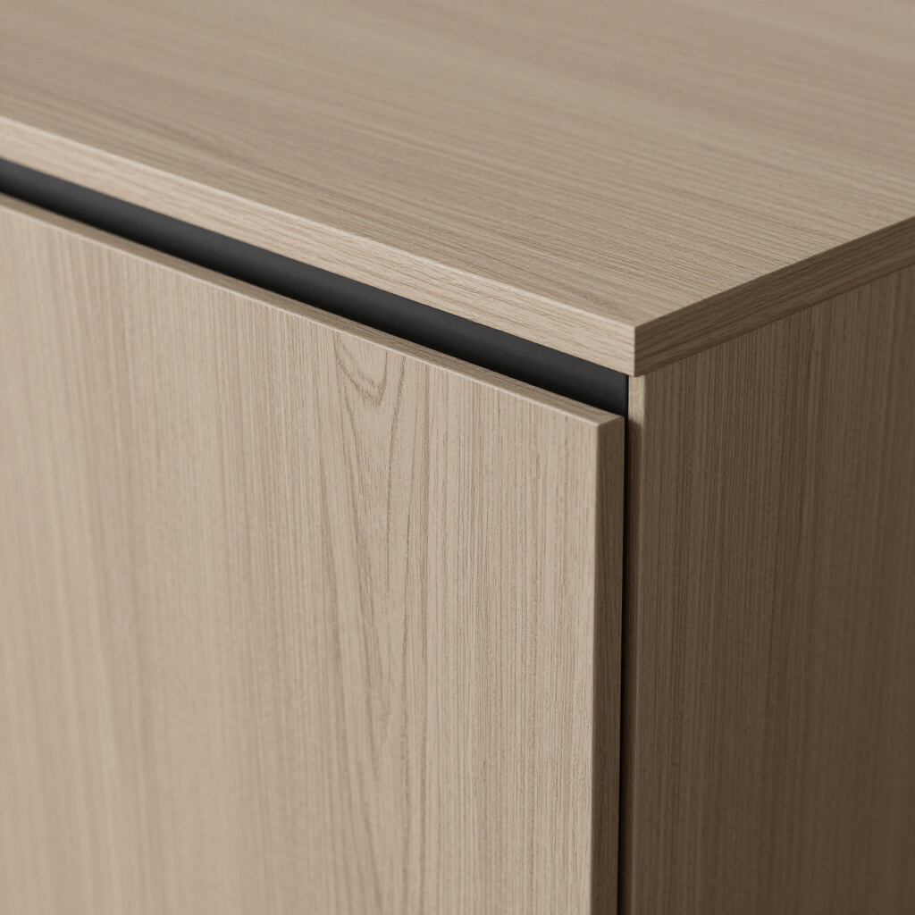 Refined Walnut veneer featuring continuous grain patterns and integrated pulls for a seamless, architectural look.